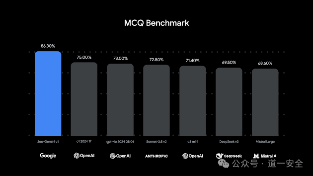 Sec-Gemini v1 在 CTI-MCQ 网络安全威胁情报基准测试中优于其他型号。