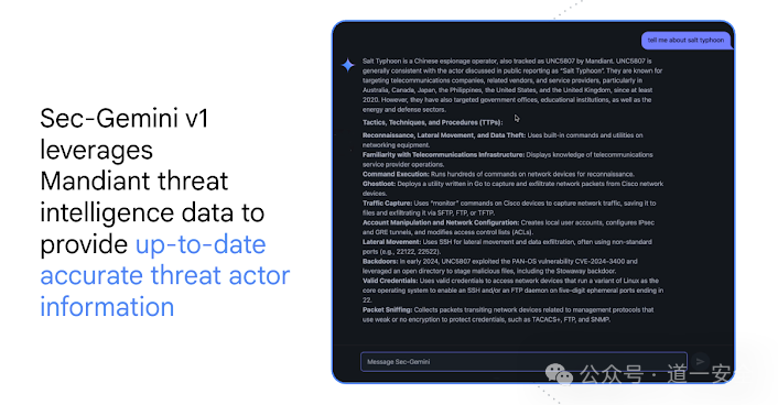 Sec-Gemini v1 旨在通过增强安全团队的能力来改变这种动态 : ✔ 近乎实时的威胁情报 (通过 Google 威胁情报、OSV 和 Mandiant 数据 )